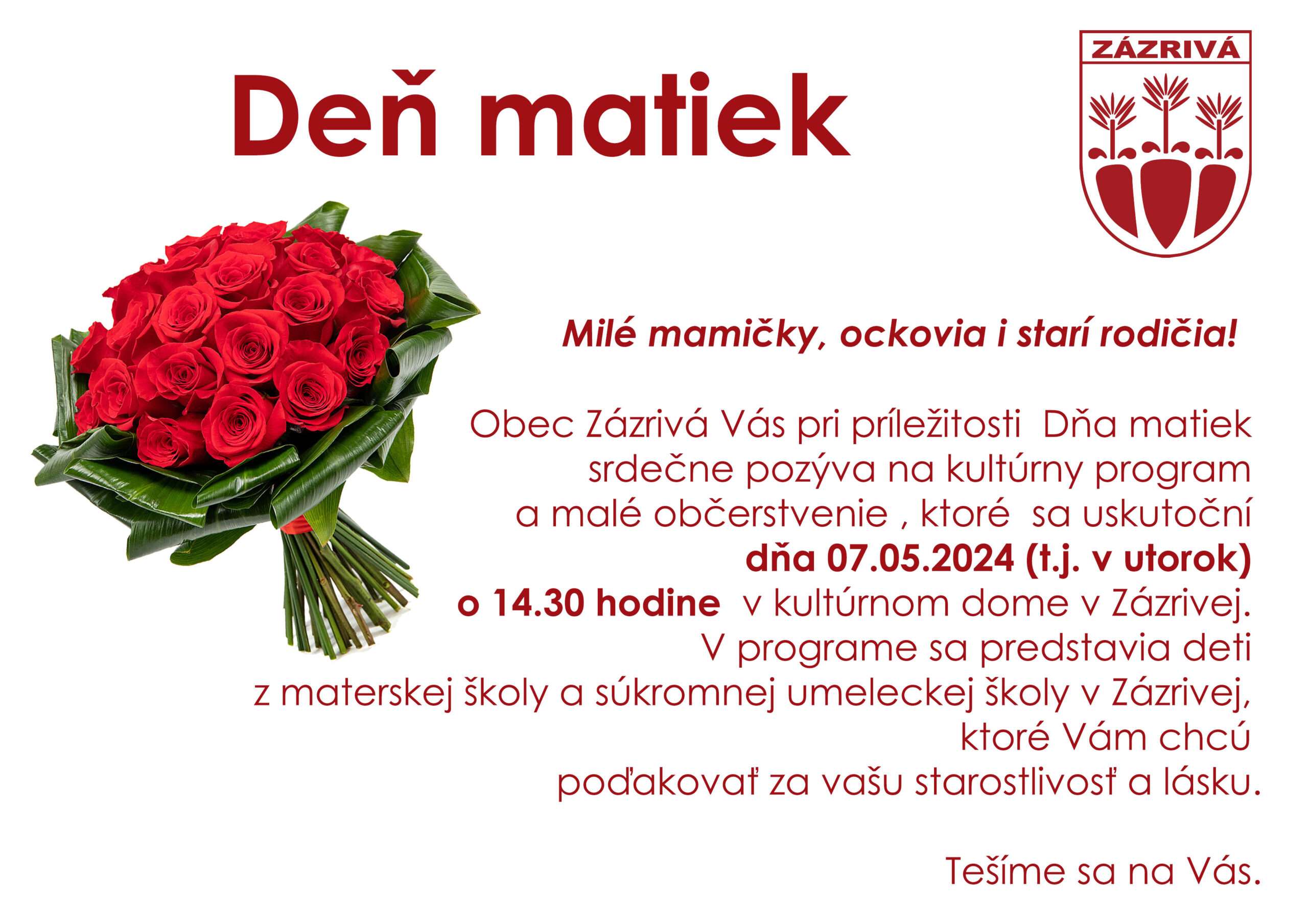 Obec Zázrivá Vás pri príležitosti Dňa matiek srdečne pozýva na kultúrny program a malé občerstvenie, ktoré sa uskutoční dňa 07.05.2024 (t.j. v utorok) o 14.30 hodine v kultúrnom dome v Zázrivej. V programe sa predstavia deti z materskej školy v Zázrivej, žiaci základnej a súkromnej umeleckej školy v Zázrivej, ktoré Vám chcú poďakovať za vašu starostlivosť a lásku.