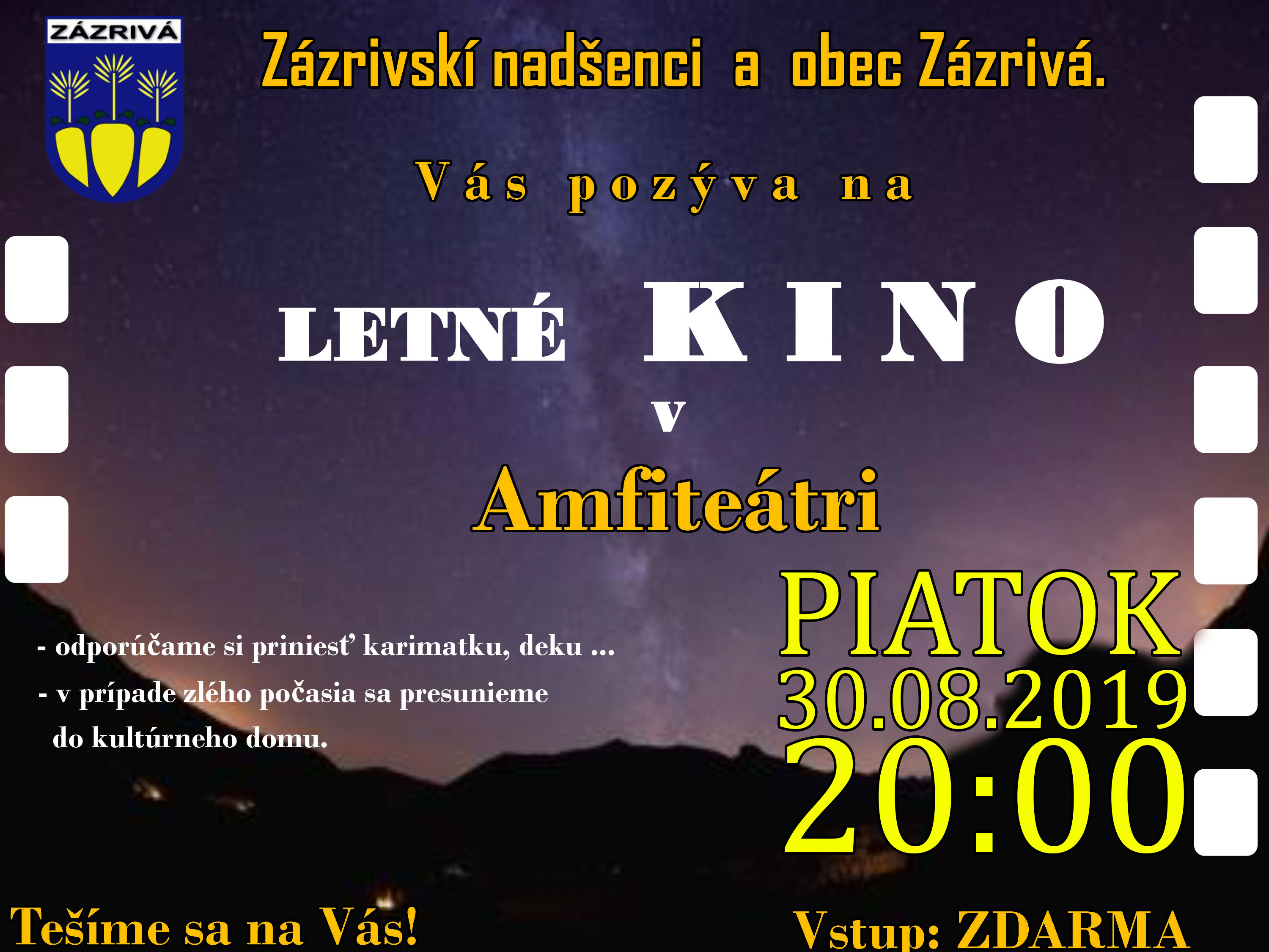 Zázrivskí nadšenci a Obec Zázrivá, Vás pozývajú na posledné letné kino v Amfiteátri Zázrivej
