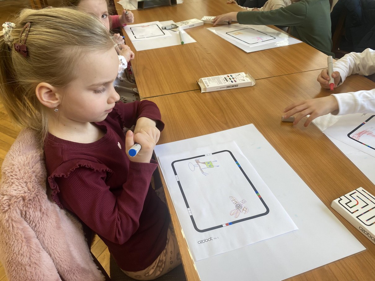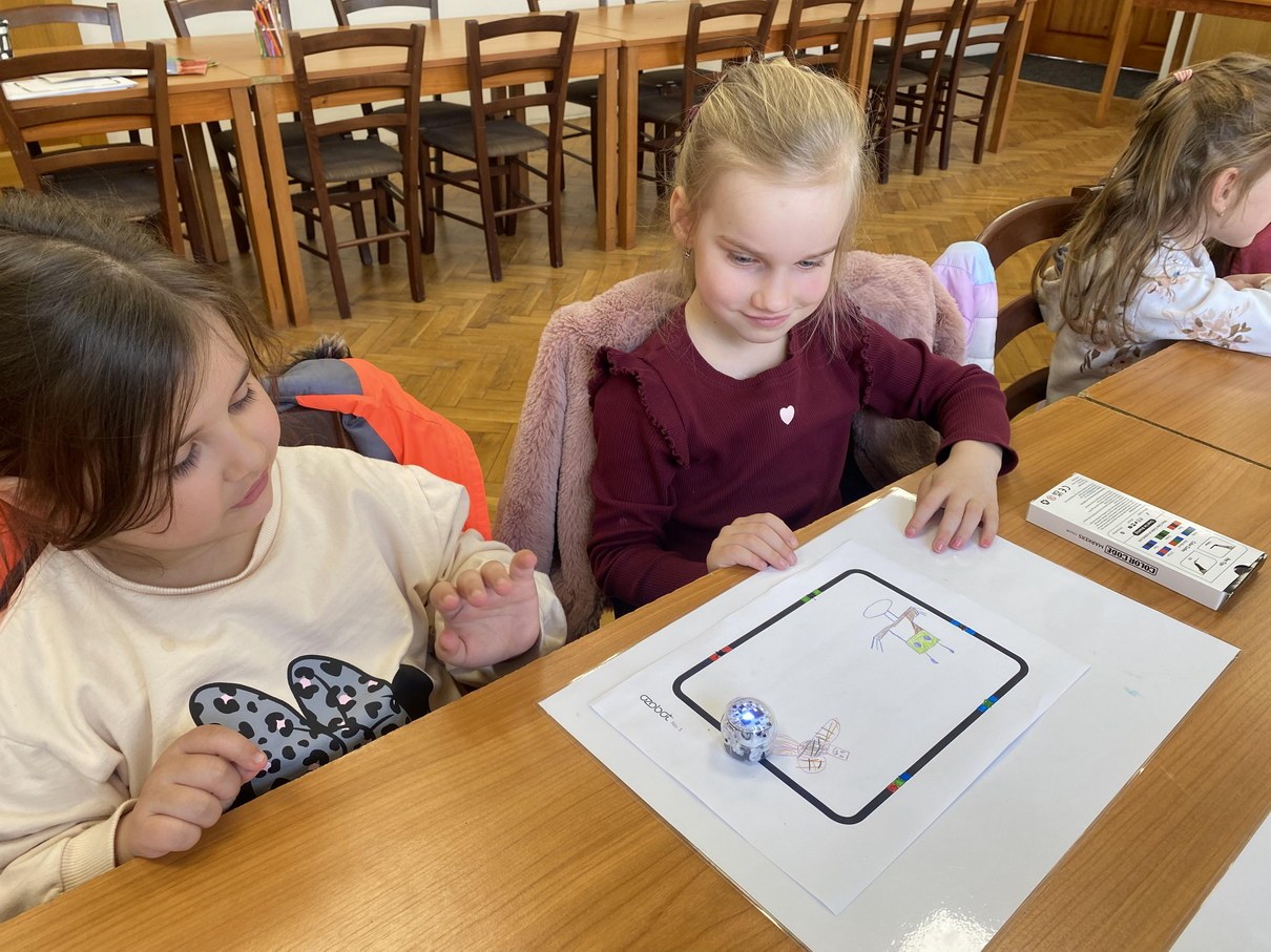 Druhú vyučovaciu hodinu knižnicu navštívili predškoláci .V úvode to bolo zážitkové čítanie z knihy O upratovacom robotovi a iné (čudné) rozprávky. V tejto knižke nájdeme príbehy o tom, čo zaujíma dnešné deti. My sme si prečítali rozprávku o Upratovacom robotovi. Ich podujatie bolo zaujímavé tým, že deti pracovali aj s ozobotmi. Ozobot je hračka, ktorá udáva smer moderného vzdelávania. Nie je to len robot, ale premyslený výukový nástroj, ktorý rozvíja technické zručnosti, kreativitu a logické myslenie. Zároveň prepája svet vedy , techniky a kreativity do zábavného a zmysluplného učenia. Vďaka prepojeniu robota s digitálnym prostredím pomáha deťom chápať princípy programovania.