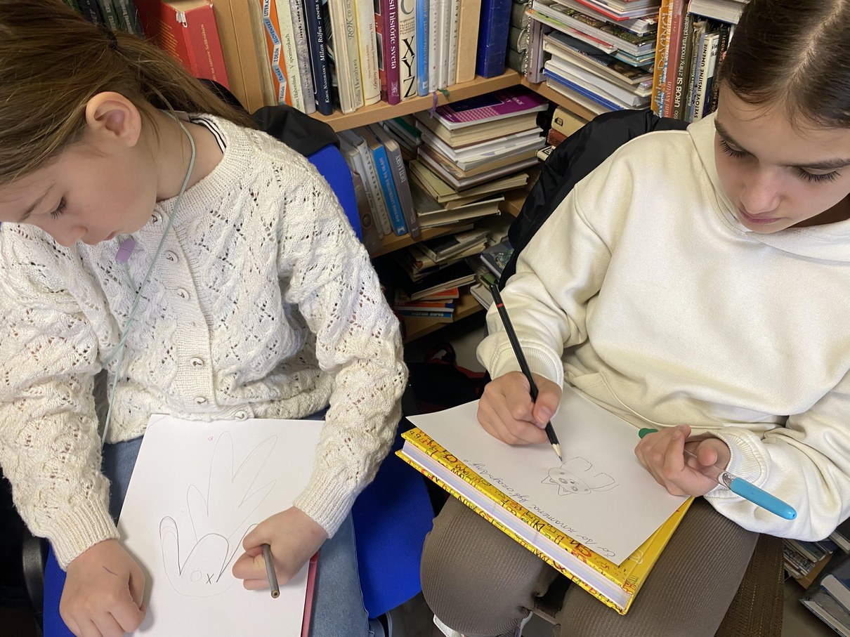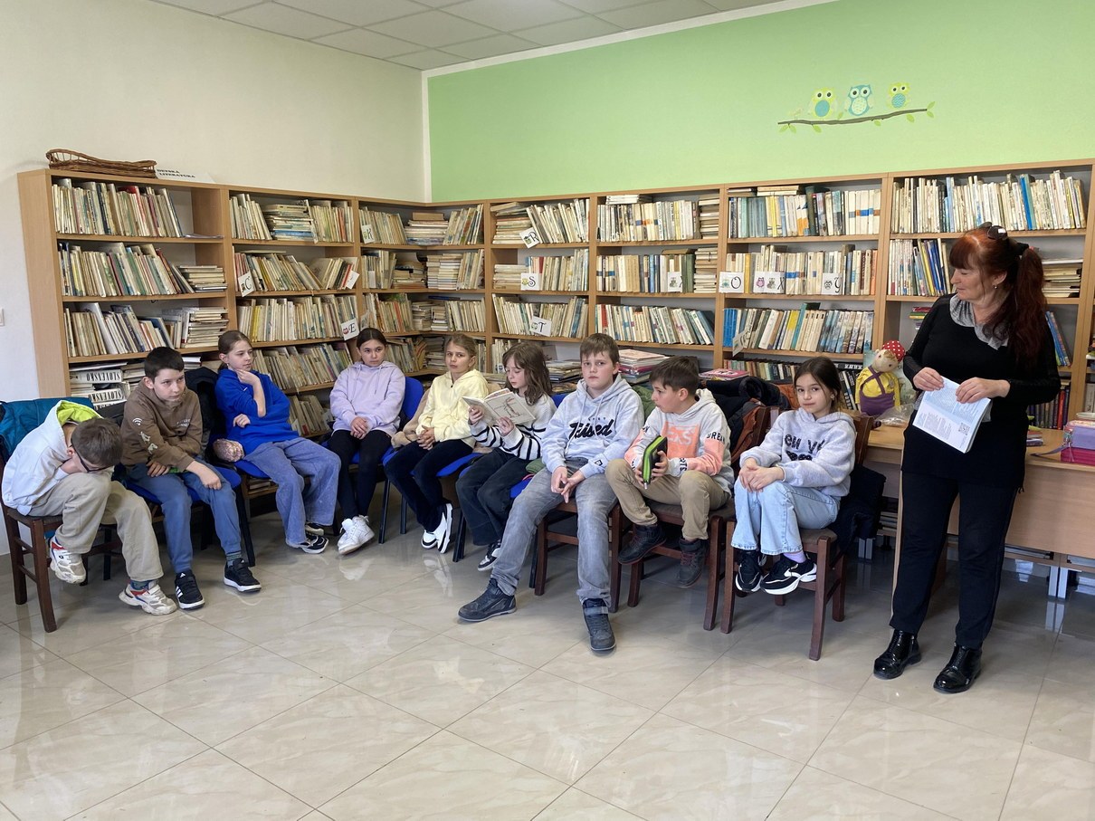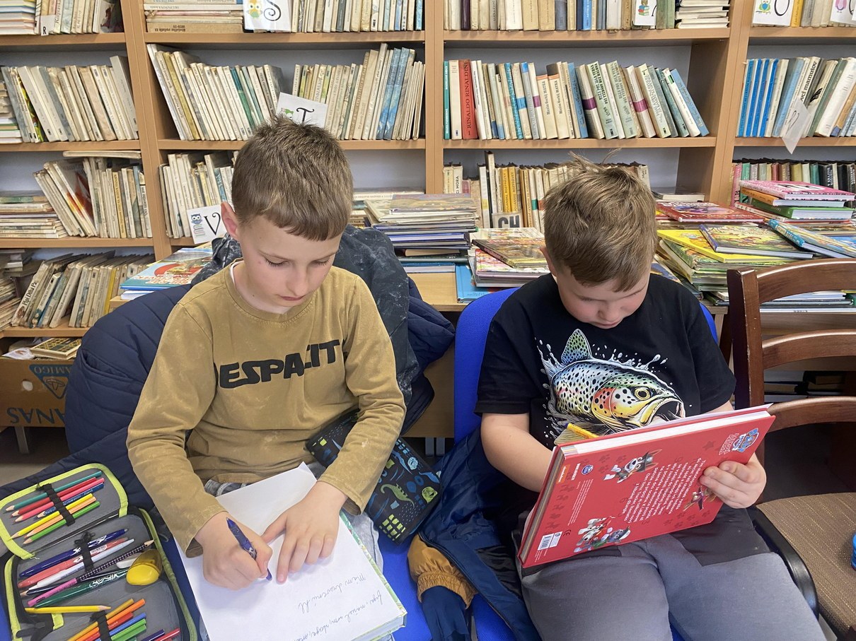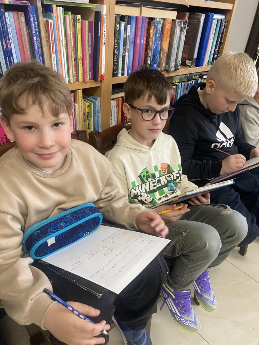 Ako prví navštívili knižnicu žiaci 5. ročníka. V úvode sme mali rozcvičku a to zo slabík, kde žiaci mali za úlohu vytvoriť čo najviac slov. Nasledovalo zážitkové čítanie z knihy od Kláry Jarunkovej O psovi, ktorý mal chlapca. Kniha bola doplnená bohatými ilustráciami. Nasledovala krátka ukážka z knihy: „Som dospelý pes a jedlo si zoženiem aj sám. Prenocujem hocikde, aj pod holým nebom. O to nejde. Lenže starať sa nemám o koho!“ Takto si vravel psík, ktorý bol presvedčený, že ku každému psovi patrí aspoň jeden človek. A tak si jedného pre seba aj vyhliadol. Rozhodnutie psíka, že si nájde svojho človeka, je celkom dobrý dôvod na príbeh. Aj to, že si vyberie malého chlapca. Tento príbeh deti dotvorili ilustráciami.